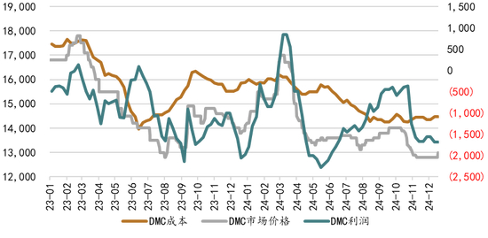 从季节性数据来看,上半年DMC产量整体平稳,三季度新产能投放开始,出现明显的增长,但是开工率反而在三季度检修季后缓慢恢复。