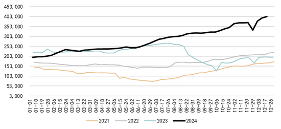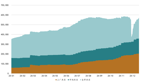 工业硅全年供给过剩,库存消纳乏力,年内总库存持续累增,自下半年起,累库速度有所加快,预计高库存情况将延续至2025年。
