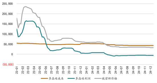 光伏产业链整体供给过剩情况下,多晶硅价格持续承压,年初经历一波降价后,硅料价格维持弱稳。行业生产成本有所下降,主要因为年内工业硅价格下降,硅粉成本回落,但由于硅料售价未有改善,行业利润情况持续恶化。自二季度初,多晶硅行业已进入全面亏损状态,并持续至年末。