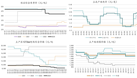 工业硅主要产业成本整体下移。年内煤炭价格整体下行,硅煤供给相对宽裕,价格较同比水平有一定程度下降。硅石价格较2023年小幅回落,硅价行情较弱,企业采购量少于预期,供需相对平衡。碳电极生产维持中高位,原料成本有所下降,下游需求一般,价格弱势运行。