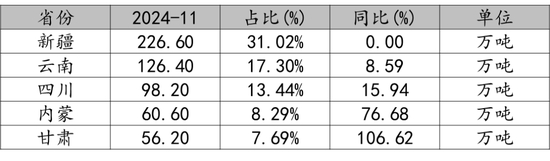 至2024年11月,全国工业硅产量约440万吨,预计全年产量可达到470万吨左右,同比增速约25.6%,大幅高于去年的14.6%。根据排产计划推演,预计2025年工业硅年产量或将继续保持小幅增长,或能达到500万吨以上。