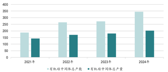 有机硅中间体产能较2023年有一定增长,新产能的投放使行业产能由2023年的272万吨增至344万吨,同比增速约26.5%。DMC产量增速约11.7%,行业开工率偏低,产量增长明显低于产能的扩张。