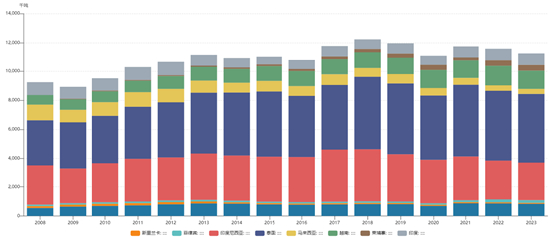 从供应端来看。在天然橡胶方面,回顾近十余年全球天然橡胶的供应情况,在次贷危机结束后的经济复苏时期,天然橡胶价格得以迅速拉升。可观的种植利润和不断扩张的下游需求,使得2010年至2012年的泰国、印度尼西亚以及越南等东南亚国家胶农的扩种橡胶树意愿提升明显,天胶产量在此时期增速明显。但随着后市天胶价格走势逐渐低迷,前期的扩张热潮得到遏制。根据天然橡胶生产国协会(ANRPC)提供数据显示,其成员国天然橡胶种植面积于2016年达到顶峰,新种面积与翻种面积在2012年便开始出现下滑。由于橡胶树的生产周期较长,近些年全球依然在享受前期胶树扩张热潮的红利。同时鉴于橡胶树的生长特性,其产能也难以在短时间内出现明显转向,因此其因产量减少而抬升胶价的逻辑仍需较长时间兑现。但不可否认的是,目前东南亚等老牌产胶国的天然橡胶产量增速在逐渐放缓,部分产区已开始有下降势头出现。