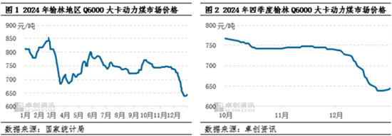 2024年四季度国内动力煤市场整体仍呈现较明显的旺季不旺特征,煤价重心整体先跌后有反弹。以榆林地区Q6000大卡动力煤为例,截至2024年12月31日主流市场价格在640-650元/吨,较9月底下跌122.5元/吨,降幅在15.96%;四季度均价在724.5元/吨,较三季度下跌14.4元/吨,降幅在1.95%。四季度价格最高点出现在10月8日为750-770元/吨,最低点出现在12与24日为630-650元/吨,价格振幅在18.75,较三季度扩大12.87个百分点。