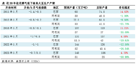 从轻度拉尼娜(指数>-1℃)的情况来看,一般造成阿根廷明显减产,巴西可能有小幅减产、也可能有不同程度增产。