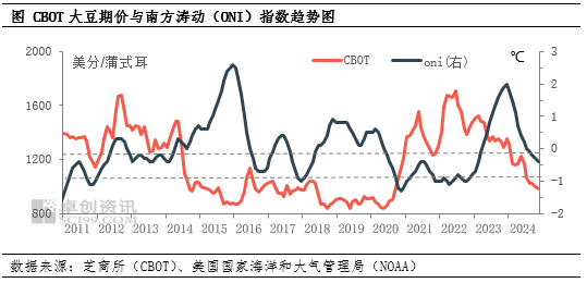 综上,根据国内外多机构的预测,2025年初出现拉尼娜气候的概率较高,中国气候中心预测可能出现一次弱拉尼娜事件。在过去二十年的六次拉尼娜气候下,阿根廷大豆产量出现减产,巴西产量增减均有,对于两国产量的影响可能产生差异。因此,预计CBOT期价或因阿根廷减产带动有走强趋势,巴西的影响未定,期价具体涨幅需关注减产的程度。