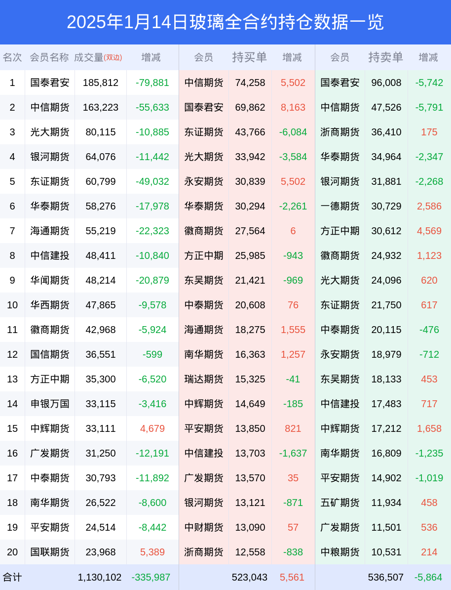 新浪期货 根据交易所数据,截至1月14日收盘主力合约玻璃2505,涨跌+3.42%,成交量88.39万手,持仓数据显示前20席位呈现净空,差额头寸为7932手。