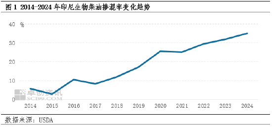 为了降低石化燃料进口依赖度,印尼自2008年开始推广生物柴油,混合比例为2.5%,即B2.5。2015年成立棕榈油基金机构(BPDPKS),用于管理生物柴油专项补贴基金,并且在2016年之后,印尼国内密集出台一系列强制掺混义务政策。在补贴激励和政策推进的双重保驾护航下,印尼生物柴油产能进入快速扩张时期,到达2023年年初,印尼在全国范围内强制推行B35。2014-2024年,印尼生物柴油掺混率5%快速提升至35%。