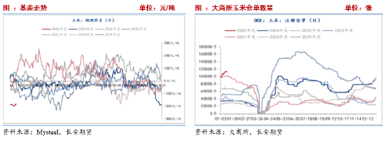 截至1月17日,期货升水181,作为对比,上周升水200,去年同期贴水13,处于近年绝对高位,十分有利于现货市场卖保与期现套利。仓单处于近年高位水平,产业套保压力犹在。截止2025年01月17日,交易所玉米期货注册仓单112,093张,环比无变化,从季节性来看,玉米注册仓单位于历史较高水平。后续来看,虽然销售进度偏快减轻节后供应压力,但春节前后仍为季节性销售高峰,且期货大幅升水利于产业卖保,仓单仍有增加空间,由此预计盘面压力依旧,在现货压力逐步出清前期货上行空间受限。
