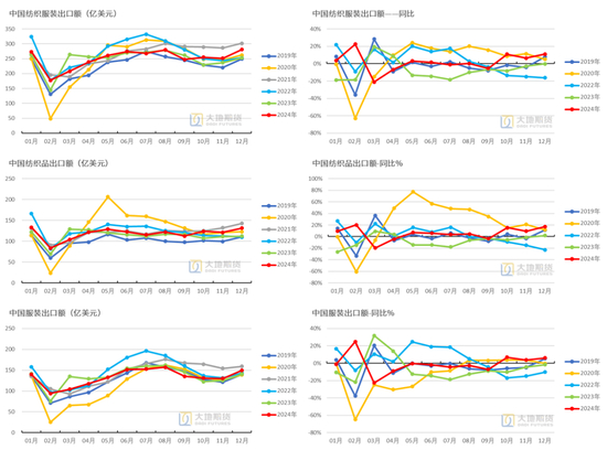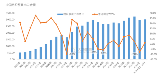 中国:2024年12月纺织服装出口同比+11.4%,1-12月出口同比+2.8%。