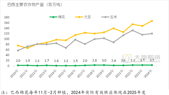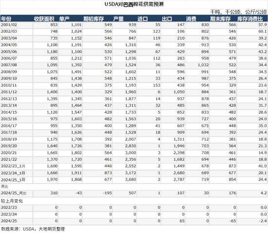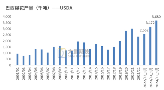 据CONAB在2025年1月预估,巴西2025年度新棉产量在370万吨,较上月估计值略上调0.49万吨。其中巴西2025年棉花种植面积为200.56万公顷,同比增3.2%,单产为1844.7公斤/公顷,同比下降3.1%。产量同比基本持平。