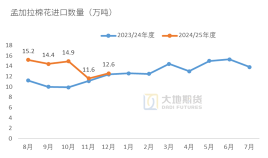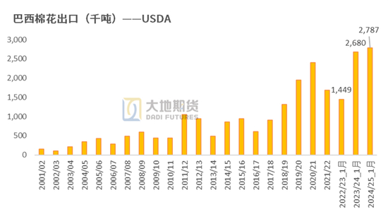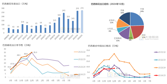 从进口来源看,2024年12月,中国进口棉花中一半以上为巴西棉,1/4为澳棉,美棉仅占比7%。