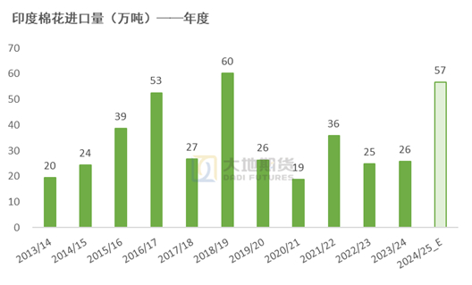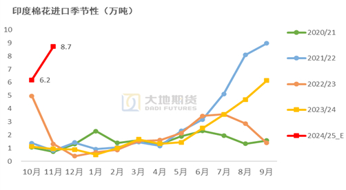 2024/25年度(2024年9月-2024年12月)中国累计进口棉花47万吨,同比-43.77%。