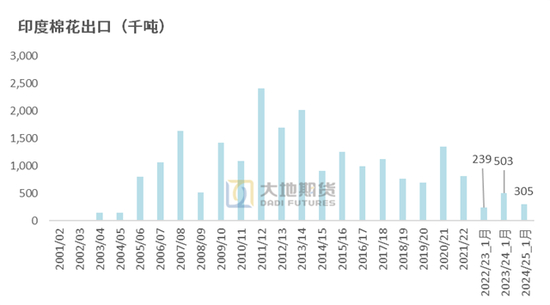 印度新棉上市量。据印度CAI统计,截至2025年1月21日,印度新棉累计上市量达到263万吨,比去年同期增加8.8万吨,目前新棉每日上市量在0.8~3万吨,新棉日上市量有所减少。印度棉花公司统计印度新棉上市量已超过1600万包(272万吨),由于印度多地举办丰收节庆祝活动,每日到货量有所下降。