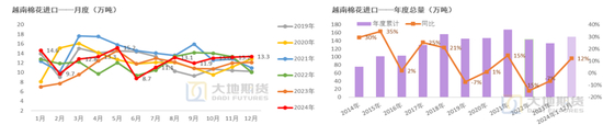 越南2024年12月出口纺服34亿美元,进口棉花13.3万吨