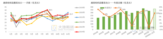 南:2024年12月纺织服装出口+11%,1-12月出口+11%。