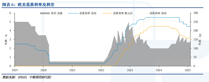 2025年2月5日,欧洲央行降息25bp至2.9%,而同期美联储维持利率不变,欧美利差扩大到160bps。预计2025年,欧洲央行延续降息节奏,而同期美国的降息节奏放缓,将导致欧美利差继续扩大。