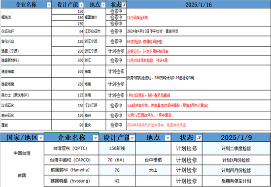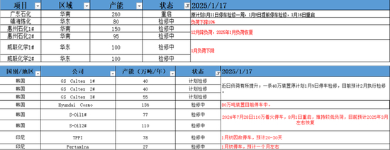 国内2月份基本上没有明确的停车检修计划,3-4月有包括九江,中海油惠州,扬子石化,天津石化有明确的检修计划。