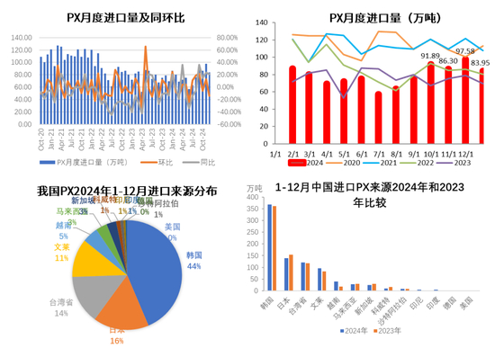 PX 2024年全年进口规模为938万吨,同比上升3.1%,自2018年后首次实现年度进口规模正增长。从进口来源占比看,排名前三的变化不大,分别为韩国(405万吨,43.2%)、日本(153万吨,16.3%)和中国台湾(132万吨,14.1%)。