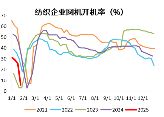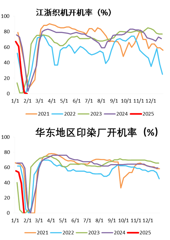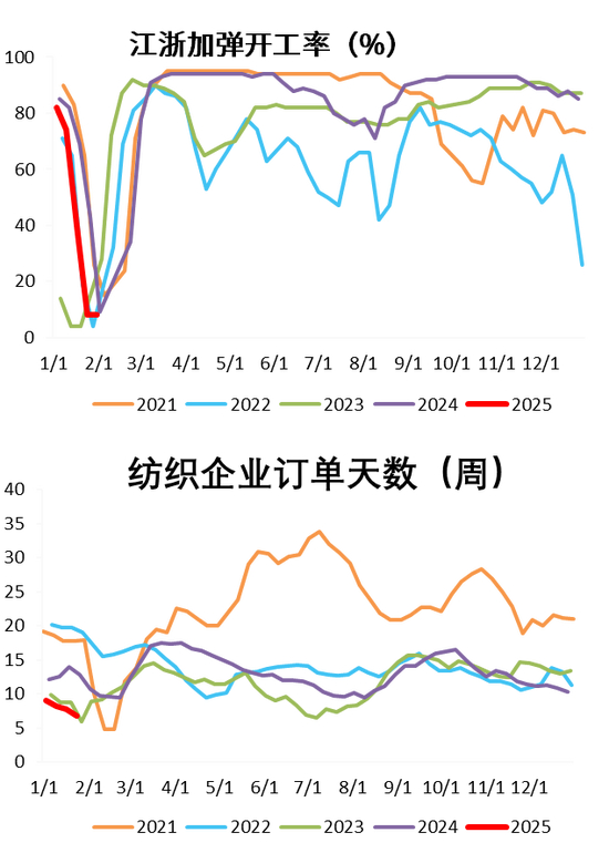 假日期间,江浙织机、加弹、圆机和印染开机率停工。截至1月31日,织机、加弹、圆机和印染开工率分别为0%、8%、5.82%、0%。