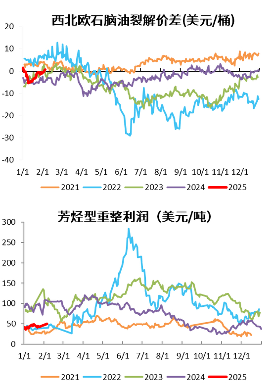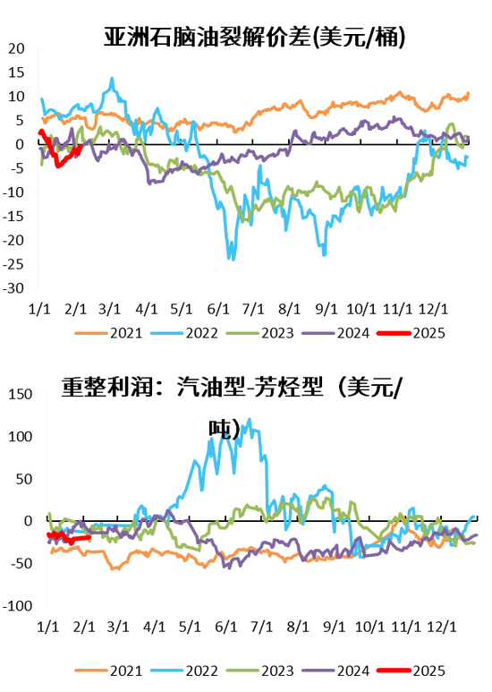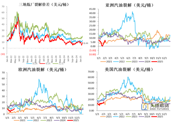 2025年,美国和欧洲部分炼厂产能的出清,欧美裂解价差表现将持续好于亚洲炼厂裂解。分阶段看,一季度,随着北半球汽油需求的见底回升,裂解价差仍有改善空间。