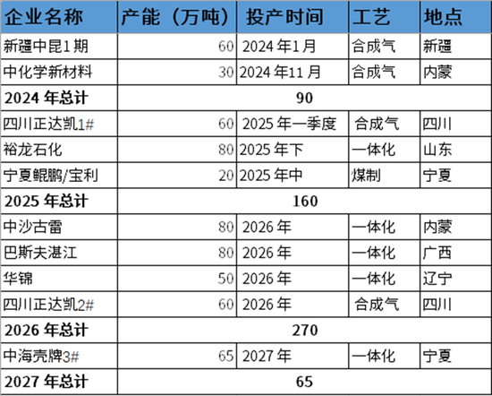 2025年预计新投产的装置有3套,分别是四川正达凯60万吨、宁夏鲲鹏20万吨、裕龙石化80万吨,共计160万吨,产能增速5.56%,高于2024年。