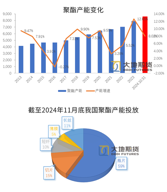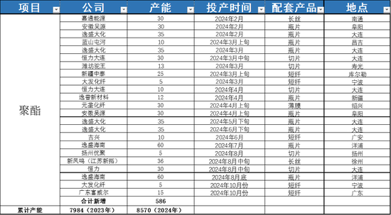 去年2023年PTA产能增速15%,今年产能增速大幅下降仅有6%,除了一季度的450万吨投产之外,独山能源三期(270万吨/年)、海伦石化(320万吨/年)延后至明年。