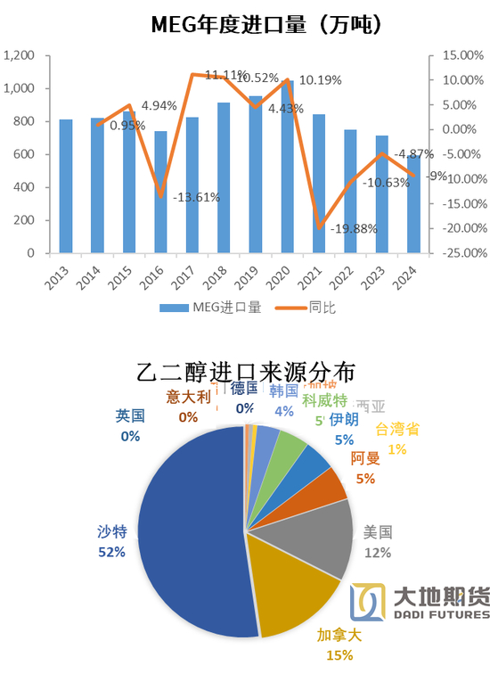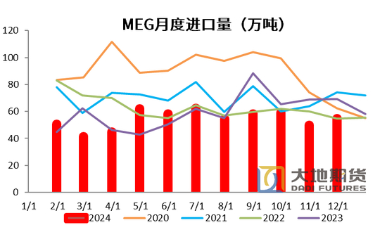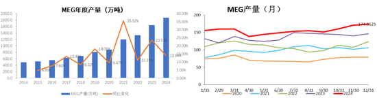 MEG12月产量174.1万吨,环比上月增加3.3万吨。2024年1-12月全年总产量1873.6万吨,同比+13.94%。