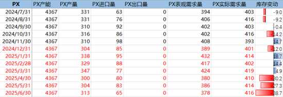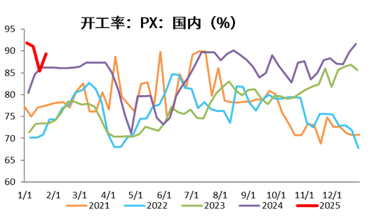 PX装置检修较少,供应量维持不变,下游PTA装置负荷下滑,基本面边际转宽松。
