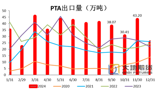 2024年1-12月份国内PTA总产量7112万吨,同比+817万吨,增幅12.9%。PTA产能和开工负荷均高于去年往年同期水平,带动产量大幅增加。12月PTA产量636万吨,环比+5.23%,同比+7.52%。