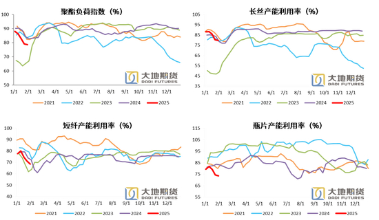 聚酯负荷回落。截止1月31日,聚酯负荷78.6%(-4.4%),其中,长丝负荷79.7%(-6.3%),短纤负荷68.5%(-8%),瓶片73.4%(-5.66%)。