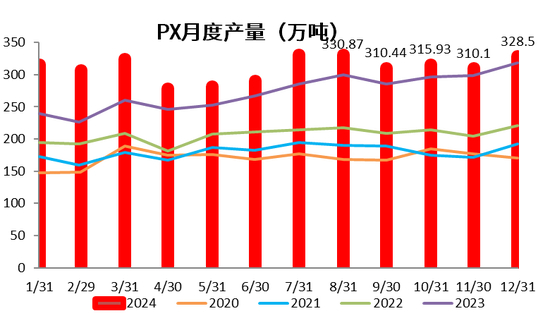 国内PX12月份产量328.5万吨,环比11月+18.4万吨,增幅+5.6。