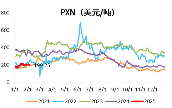 PX期货价格,2025年2月5日,主力合约收于7152元/吨,环比两周前-180元/吨,跌幅2.45%。