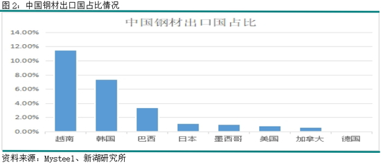 对于中国来说,中国直接出口至美国的钢铁总量并不大。根据海关总署的数据统计,2024年中国钢材总的出口量为11106.3万吨。其中,2024年中国出口至美国的钢材总量仅为89.17万吨,同比增加5.51%。中国直接出口至美国的钢材总量占中国全部钢材出口量的比例仅为0.8%。由于中国钢材主要是出口至东南亚以及“一带一路”等国家,直接出口至美国的钢材占比有限,美国加征关税对于中国钢材直接影响有限。但2024年中国出口至美国钢铁主要进口国的量占中国钢材总出口量的比例为25.22%。特别是越南,2024年中国出口至越南的钢材产量占中国总的出口量比例达到11.49%。越南是中国主要的钢材进口国,也是美国钢材主要进口来源国。美国对全球国家钢材加征进口关税,这会导致中国钢材的转口贸易受到打击。