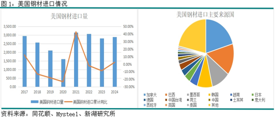 总体来说,中国钢材直接出口受美国加征关税的影响相对有限。但中国出口至美国钢材主要来源国的比例达到25.22%。因此美国对全球国家钢材加征关税,将会对中国的钢材转口贸易造成影响,从而影响中国钢材的间接出口。不过特朗普在其首个总统任期内,对钢铁和铝分别实施了25%和10%的关税措施。随后他为加拿大、墨西哥和巴西等贸易伙伴提供了免税配额的优惠。在此基础上,美国前总统拜登进一步扩展了这一政策,将免税配额的适用范围扩大到了英国、日本以及欧盟等国家与地区。因此,美国仍有为部分国家提供免税配额的预期,后期需要关注美国特朗普政府是否会再次为部分国家钢材进口提供免税配额。