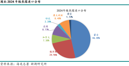 但是,从我国炼焦煤进口结构来看,主要以“蒙煤”+“俄煤”为主,2024年全年进口美国的炼焦煤量约1067万吨,占全年炼焦煤进口量比例约8.7%,占全年炼焦煤总供应量比例约1.8%,占比较低。且由于我国当前煤焦市场整体供应偏过剩,若为应对美国对钢铁行业的关税升级方案而加征美煤进口关税,利润驱动下可能促使国内企业转向其他供应国(如俄罗斯、澳大利亚或蒙古),从而一定程度上缓解国内煤焦市场的供应压力。