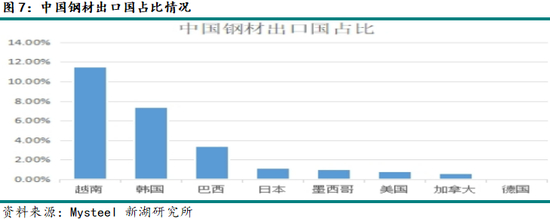 对于中国来说,中国直接出口至美国的钢铁总量并不大。根据海关总署的数据统计,2024年中国钢材总的出口量为11106.3万吨。其中,2024年中国出口至美国的钢材总量仅为89.17万吨,同比增加5.51%。中国直接出口至美国的钢材总量占中国全部钢材出口量的比例仅为0.8%。由于中国钢材主要是出口至东南亚以及“一带一路”等国家,直接出口至美国的钢材占比有限,美国加征关税对于中国钢材直接影响有限。但2024年中国出口至美国钢铁主要进口国的量占中国钢材总出口量的比例为25.22%。特别是越南,2024年中国出口至越南的钢材产量占中国总的出口量比例达到11.49%。越南是中国主要的钢材进口国,也是美国钢材主要进口来源国。美国对全球国家钢材加征进口关税,这会导致中国钢材的转口贸易受到打击。