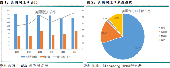 在美国铜消费结构中,约一半的量来源于进口。24年由于年中COMEX逼仓的影响,美国铜进口量大幅攀升,进口占比由23年的50%升至57%。24年美国共进口精铜92.6万吨,其中70%来自于智利,约17%来自于加拿大,墨西哥仅占1.9%。