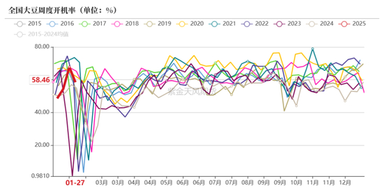 截至2.7当周,124家油厂大豆实际压榨量为46.77万吨,开机率13.15%(节前一周压榨量207.95万吨,开机率为58.46%)。