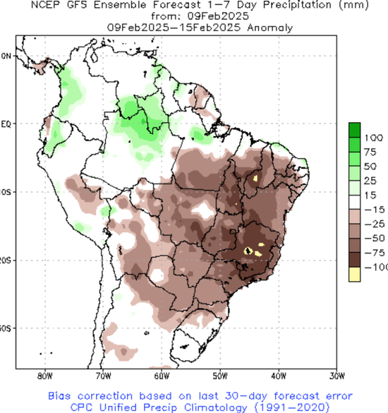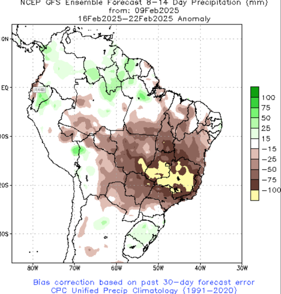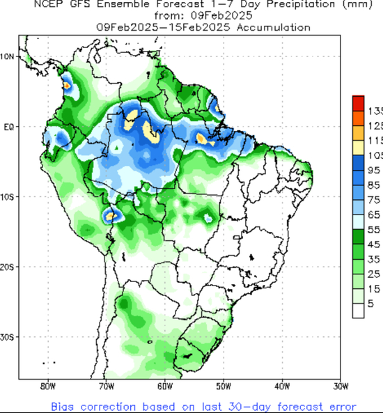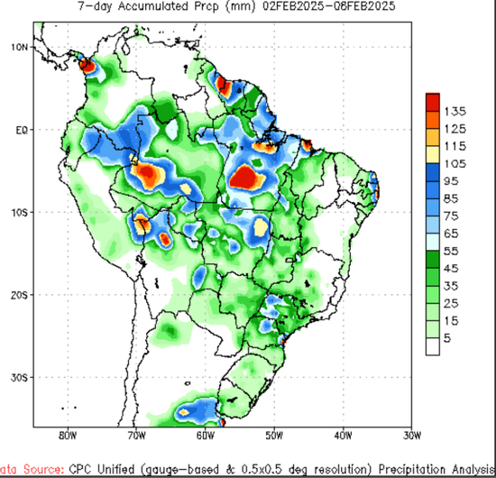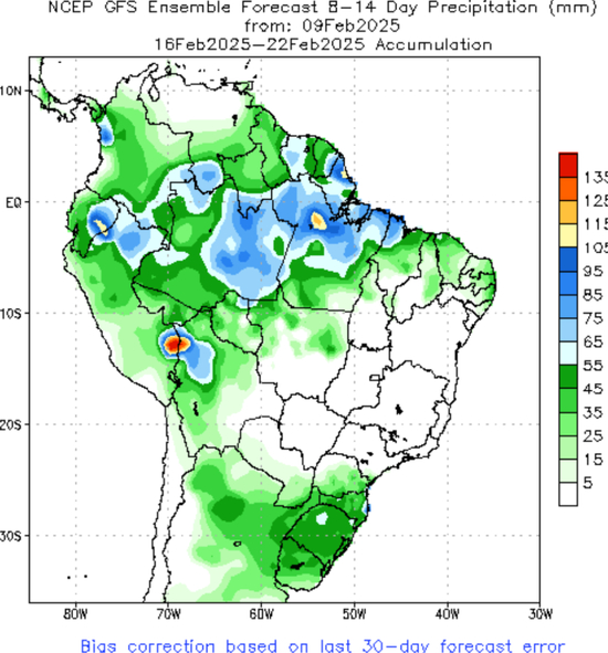 未来一周(2.9-2.15)预计主产省获得15-45mm降水,至2月下旬雨势依旧。