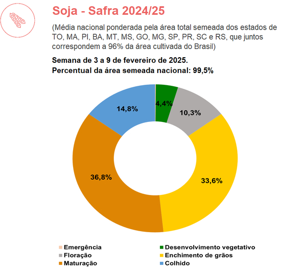 截至2.9,收获进度14.8%(去年同期20.9%)。当前幼苗阶段大豆占比4.4%,开花阶段占比10.3%,灌浆鼓粒阶段占比33.6%,成熟阶段占比36.8%。