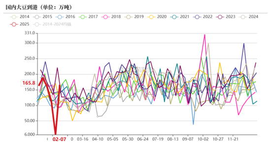 大豆到港量:截至2.7当周,国内大豆到港172.25万吨(年前一周到港126.75万吨)。