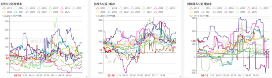 2.10,美湾、巴西、阿根廷产地贴水分别为82美分/蒲(周度下跌21美分/蒲)、17美分/蒲(前周18美分/蒲)、120美分/蒲(周度持平)。