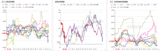 南美大豆:中性 更多巴西大豆进入成熟阶段,收获进度依旧较去年落后,截至2.9,收获进度为14.8%,落后较多的如MT、GO。不过后续天气预报显示除了MT北部,中西部其他区域偏干,有利收获推进。阿根廷过去一两周获得有益降水,虽然作物优良率仍旧下滑,但土壤湿度已有回升迹象,后续雨势预报积极。南美大豆贴水本周较强,主要由于巴西大豆未上量。上周传巴西转运设施瓶颈已经得到解决,对华排船、发船环比提高。ANEC最新表明,预计2月巴西将出口830万吨至1123.8万吨大豆,1月份的大豆装运总量为110.4万吨,去年2月,巴西出口了960.8万吨大豆,当前据McD,对巴西大豆2月船期的采购为600万吨以上,装船发运进度有待观察。