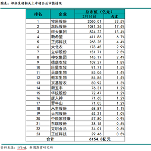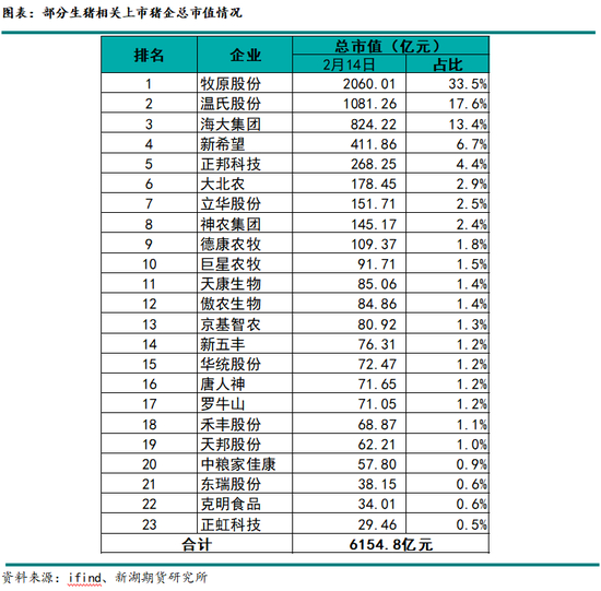 据不完全统计,23家生猪养殖相关上市企业,截止2月14日市值合计达6154.8亿元,总市值过百亿的上市猪企共9家,其中牧原股份市值占比位居第一,总市值为2060.01亿元,占全部23家上市猪企总市值比重高达33.5%,温氏股份以1081.26亿元总市值位居第二,占全部23家上市猪企总市值比重为17.6%,牧原股份和温氏股份也是目前仅有的两家总市值过千亿的上市猪企。