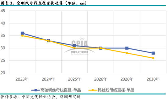 金刚线主要分为高碳钢丝线和钨丝线,钨丝线是未来的发展方向,其母线直径相对更低。根据中国光伏行业协会预测数据,高碳钢丝母线和钨丝母线直径均将维持下降趋势,其中钨丝母线直径预计仍将占据一定优势。