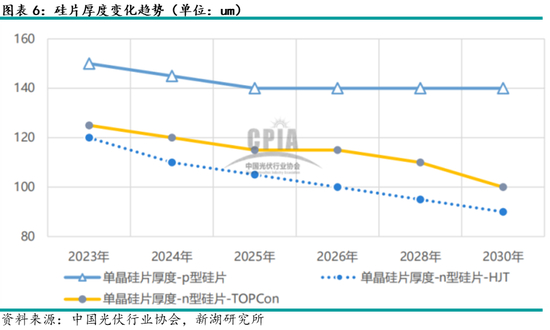 根据中国光伏行业协会提供的数据预测,主流的N型硅片在行业竞争压力下,不论是目前行业占比最大的TOPCon,还是紧随其后的HJT,依然有持续薄片化的动力。