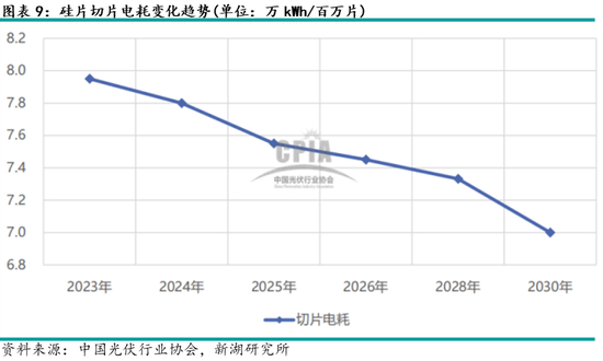 除了硅耗以外,硅片薄片化和切割的细线化同样降低了切片电耗及水耗。