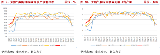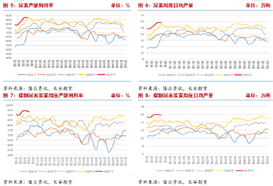 上周国内尿素装置产能利用率87.09%,环比下降0.72个百分点,低于去年同期0.13个百分点,基本持平,但随着去年产能的增加,产量仍高出去年同期,上周尿素日均产量19.52万吨,环比减少0.14万吨,降幅0.71%,同比增加0.63万吨,增幅3.36%。