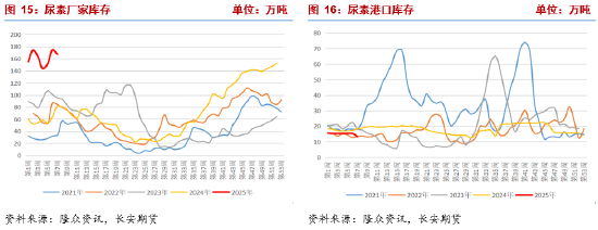 库存方面,隆众统计上周尿素厂家库存166.94万吨,环比去库7.65万吨,降幅4.38%,同比增加85.13万吨,增幅104.06%,仍远高于往年同期。年后尿素日均产量维持在19万吨以上,上周在高供应背景下,厂家大幅去库,支撑下游采购情绪,推动价格上涨,而价格上涨又进一步刺激下游拿货积极性,本周企业收单较好,预计库存仍将下降,关注去库幅度及去库斜率。港口库存13.2万吨,环比去库2万吨,同比减少5.1万吨,港口尿素库存量相对平稳,出口不定期有消息流出,但均未验真,目前仍受管控,港口暂无集港趋势,预计短期内港口库存维持当前水平波动,对行情指导意义不大。